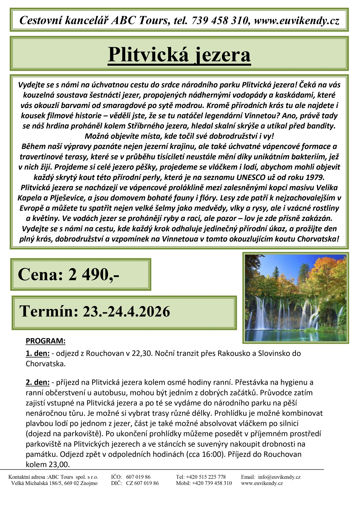 Naše škola pořádá ve spolupráci s cestovní kanceláří ABC Tours zájezd pro žáky druhého stupně na Plitvická jezera. Rodiče těchto žáků dnes dostanou informace do žákovské knížky.